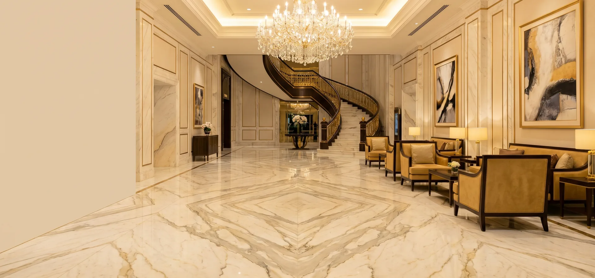 Calacatta italien, Carrara, travertin, granit, calcaire. Sourcés directement en carrière européenne, spécifiés à votre esthétique, installés avec scellants climat tropical. Pour halls d'hôtel, salles bancaires, ambassades, résidences de luxe, bâtiments historiques.