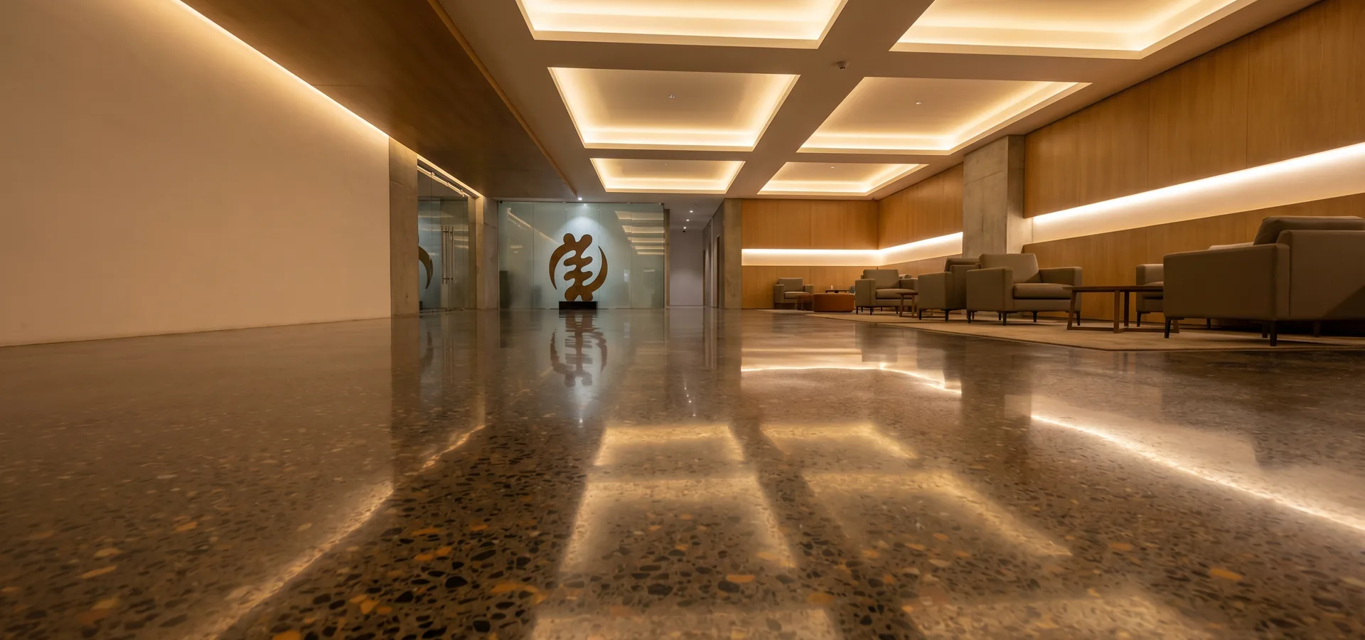 Level 4 mirror polish across 1,200 m² hotel lobby.